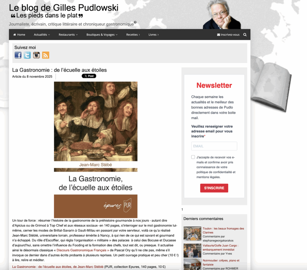 Le blog de Gilles Pudlowski « Les pieds dans le plat » parle du dernier ouvrage de Jean-Marc Stébé « La Gastronomie, de l’écuelle aux étoiles« .