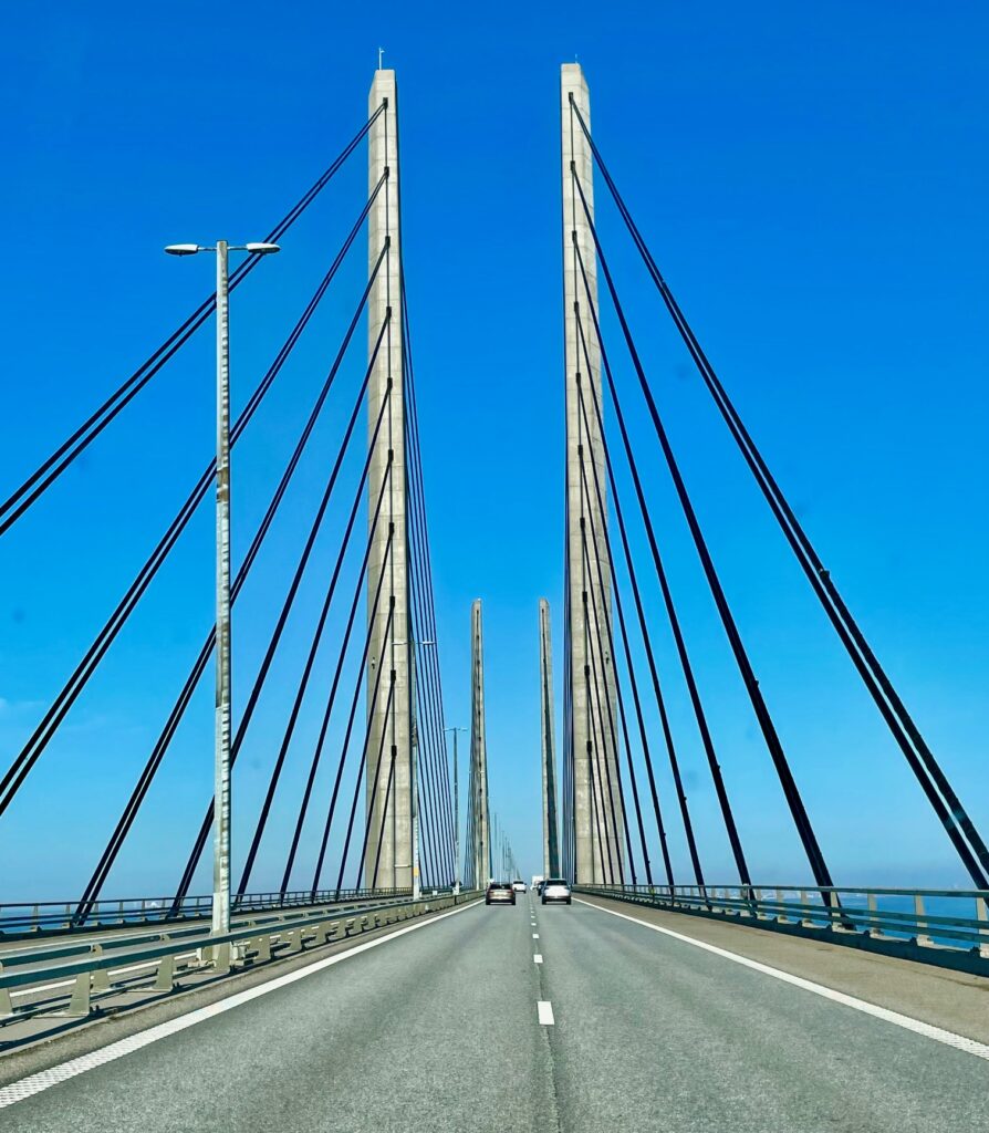 LE PONT DE L’ÖRESUND (Suède-Danemark) – Septembre 2025. Avec son prolongement par une île artificielle puis un tunnel, le pont de l’Öresund relie les villes de Malmö en Suède et de Copenhague au Danemark. Inauguré en juillet 2000, ce pont à deux niveaux (une partie supérieure autoroutière et une partie inférieure ferroviaire) a été conçu par l’architecte danois Georg Rotne. Véritable prouesse technologique, le pont de l’Öresund au design architectural indéniable possède l’un des plus longs tabliers suspendus par haubans au monde. Sa longueur totale est de 7 845 m, dont 1 092 m suspendus à 160 câbles, à plus de 60 m au-dessus de la mer. Il est constitué de quatre pylônes mesurant 204 m qui permettent de disposer d’un tirant d’air de 57 m.