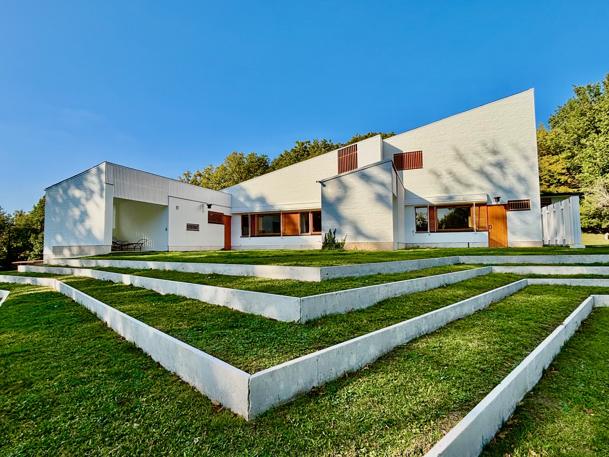 LA MAISON CARRÉ (Bazoches-sur-Guyonne – Yvelines) – Octobre 2025. Située à l’ouest de Versailles à une quarantaine de kilomètres de Paris, la Maison Carré est une résidence privée construite de 1957 à 1960 par l’architecte finlandais Alvar Aalto pour le compte de Louis Carré, collectionneur d’art contemporain et galeriste. Bien qu’il connaisse et apprécie Le Corbusier, Mr Carré lui préfère Alvar Aalto qui propose dans ses réalisations un style moins radical. Lors de la commande, le collectionneur d’art a peu d’exigences, sinon une toiture d’ardoises rappelant sa Bretagne natale et des espaces pouvant accueillir ses collections. L’architecte finlandais fait appel dans ses réalisations architecturales au bois, et dans les espaces intérieurs de la Maison Carré, il utilisera de manière importante le frêne, le pin, le hêtre, le chêne pour habiller entre autres les portes et claustras du salon et le plafond en vague de la grande entrée. Cette villa, entièrement meublée des créations de l’architecte (bureau, tables, luminaires…), sera vendue par les héritiers d’Olga Carré – la troisième épouse de Louis – à l’association Alvar Aalto en France. Classée au titre des monuments historiques, elle est ouverte au public depuis 2007.