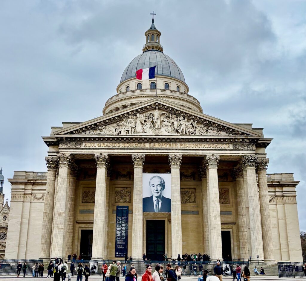 LE PANTHÉON (Paris – 5e) – Février 2026. Édifié au milieu du XVIIIe siècle par décision de Louis XV en tant qu’église dédiée à Sainte-Geneviève, le Panthéon de Paris est transformé au début de la Révolution française en monument funéraire en l’honneur des grands personnages de l’histoire contemporaine. Implanté sur la montagne Sainte-Geneviève, cet édifice imposant de style néo-classique a été construit sous la direction de l’architecte Jacques-Germain Soufflot (1713-1780). Son architecture reprend notamment la façade du Panthéon de Rome, édifié au Ier siècle avant notre ère. Il est surmonté d’un dôme inspiré du Tempietto de l’église San Pietro in Montorio (début du XVIe siècle), aussi à Rome. Portant sur son fronton la devise « Aux grands Hommes, la Patrie reconnaissante », le Panthéon abrite majoritairement des personnalités civiles telles Voltaire, Victor Hugo, Émile Zola, Jean Jaurès, Jean Moulin ou encore Pierre et Marie Curie – les militaires étant honorés aux Invalides. Ces dernières années, on y a transféré Simone Veil (2018), Maurice Genevoix (2020), Joséphine Baker (2021), et Robert Badinter (2025).