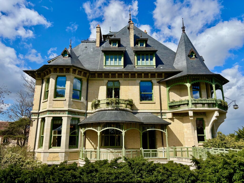 LA VILLA DEMOISELLE (Reims – Marne) – Mars 2026. Édifiée au cours de la décennie 1900 par l’architecte Louis Sorel, la Villa Demoiselle est un bel exemple de demeure alliant Art nouveau et Art déco. La villa est construite sur une structure principale en béton et dispose d’une charpente en partie métallique. Cet ensemble de béton et de métal permettra à la demeure de résister aux oscillations et aux effets de souffle des bombardements de la Première Guerre mondiale. Henry Vasnier, directeur financier de la maison de champagne Pommery et commanditaire de la villa, meurt en 1907 avant la fin des travaux. Le nouveau directeur du Domaine Pommery, Louis Cochet, baptise la villa de son patronyme. Habitée jusque dans les années 1980 par les cadres de la maison Pommery, elle est menacée de démolition, mais la ville de Reims va protéger la demeure, et en 2004, Paul-François Vranken, alors président du groupe Vranken-Pommery Monopole, en devient propriétaire. Il entreprend immédiatement sa rénovation en suivant le plus rigoureusement les éléments fournis par les documentations de l’époque. Des œuvres d’Émile Gallé, Louis Majorelle et de René Lalique retrouvent leur place à l’intérieur de la villa. La villa est renommée Villa Demoiselle par le nouvel acquéreur en écho à sa première cuvée, le champagne Demoiselle.